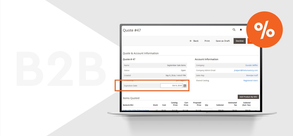 Im B2B-Bereich ist es üblich, vergünstigte Preise auszuhandeln, wenn z. B. Produkte in großen Mengen bestellt werden. Durch einen strukturierten Workflow können Unternehmen in Magento Commerce Angebotsanfragen auf effiziente Weise verwalten und Preisverhandlungen führen. So können Einkäufer beispielsweise Rabatte für einzelne Produkte oder Versandkosten direkt im System anfragen und den Status der Anfrage online nachverfolgen.