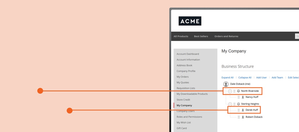 Mit Magento Commerce kann der Admin nun für jeden seiner Mitarbeiter einen eigenen Zugang zum Unternehmens-Account des Baumarktes einrichten, ihnen Rollen zuweisen (“Einkaufsleiter”, “Leiter Einkauf Eisenwaren”, “Einkäufer Türbeschläge” usw.) und per Drag&Drop ganz einfach die Organisationsstruktur im System abbilden. Da sich die Verantwortungsbereiche je nach Position in der Unternehmens-Hierarchie unterscheiden, können den einzelnen Personen nun Berechtigungen zugewiesen werden. Während beispielsweise der Bereichsleiter Einsicht in sämtliche Prozesse erhält, können die verschiedenen Einkäufer nur Bestellungen für ihren jeweiligen Fachbereich auslösen, die dann ggf. noch von dem Abteilungsleiter freigegeben werden müssen. Auf diese Weise kann genau bestimmt werden, welche Mitarbeiter Preisverhandlungen führen oder Bestellungen tätigen dürfen, wer Änderungen im Unternehmensprofil vornehmen kann, welche Zahlungsmodalitäten jeweils akzeptiert werden usw.