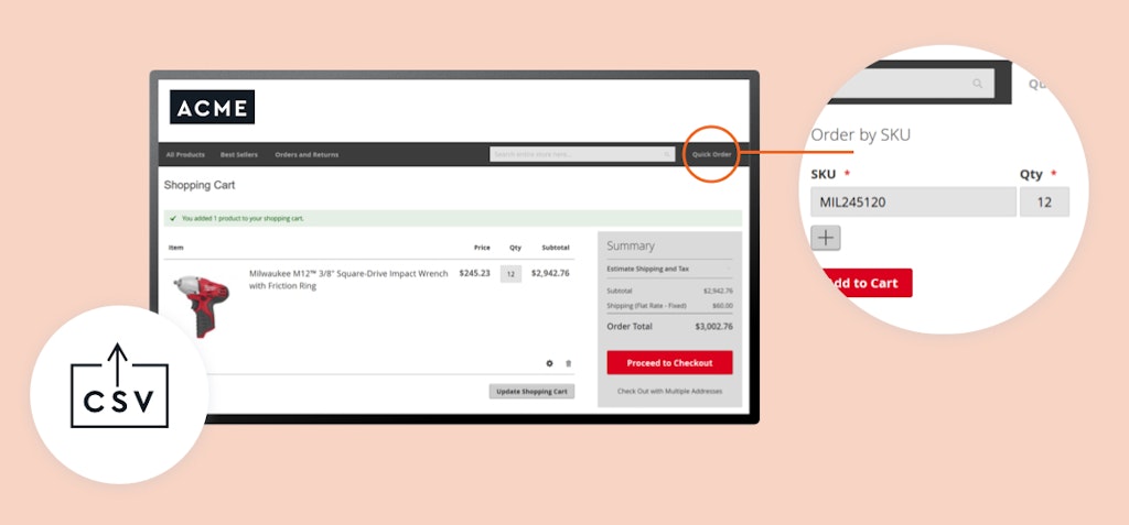 Durch die Eingabe von SKUs oder durch den Upload einer CSV-Datei können Geschäftskunden über Magento schnell und unkompliziert Bestellungen tätigen. Der Bestellvorgang lässt sich dadurch enorm beschleunigen.