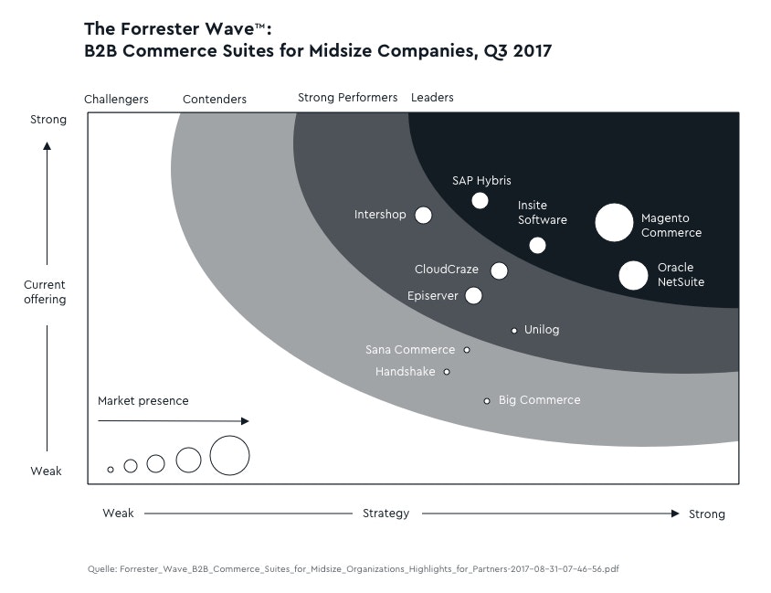 Magento ist bekannt für die Vielzahl an konfigurierbaren Funktionen, die sich durch individuelle Extensions schnell, einfach und effizient an die speziellen Anforderungen von B2B E-Commerce anpassen lassen. Dass Magento sich sehr gut für die Realisierung von B2B-Onlineshops eignet, bestätigt auch Forrester Research. Bei einem Vergleich von elf Shopsystemen hat der Marktanalyst die kostenpflichtige Version Magento Commerce 2.2 als eine der führenden Technologien für mittelständische B2B-Unternehmen ausgezeichnet.
