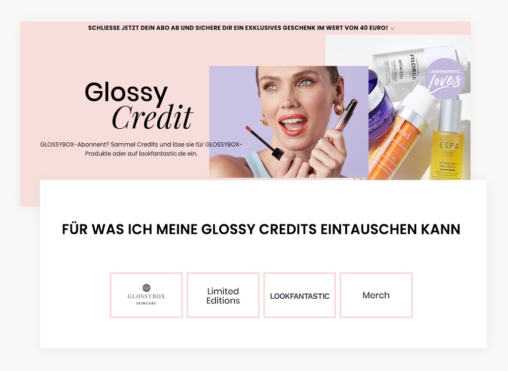 Das Erkunden der Kundenwünsche lässt sich optimal mit einem Treueprogramm verbinden. Glossybox, ein erfolgreicher Anbieter für Abo Commerce, macht es vor: Wenn Kund:innen an Produktumfragen teilnehmen, können sie monatlich Bonuspunkte im Wert von bis zu 7 Euro verdienen. Diese lohnenswerte Summe können sie gegen frei wählbare Beauty-Produkte und Sondereditionen eintauschen.