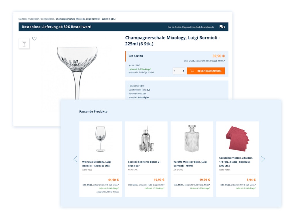Das Ziel von Up-Selling und Cross-Selling ist es, die Kund:innen dazu zu bewegen, komplementäre oder bessere Versionen der Produkte zu kaufen, die sie bereits zu kaufen beabsichtigen. So werden beim Cross-Selling typischerweise unter der Überschrift “Wird häufig zusammen gekauft” Artikel vorgeschlagen, die das ausgesuchten Produkt ergänzen ‒ beispielsweise Farbpatronen zu einem Drucker oder passende Accessoires zu den ausgewählten Kleidungsstücken.