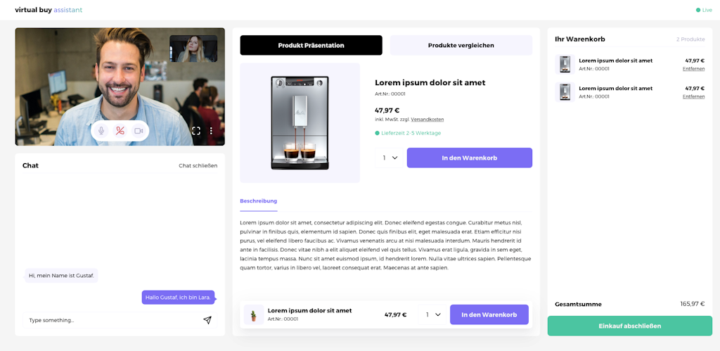 Assisted Shopping, d.h. eine Live-Beratung per Videochat, ist eine spannende Möglichkeit für Shopbetreiber, ihre Kund:innen beim Online-Kauf zu unterstützen. Dies gilt insbesondere für komplexe Produkte, die eine tiefergehende Beratung erfordern. Ein Live-Videochat erhöht dabei nicht nur die Online-Verkaufszahlen beratungsintensiver Waren, sondern schafft darüber hinaus auch ein positives Kauferlebnis und eine stärkere Kundenbindung.