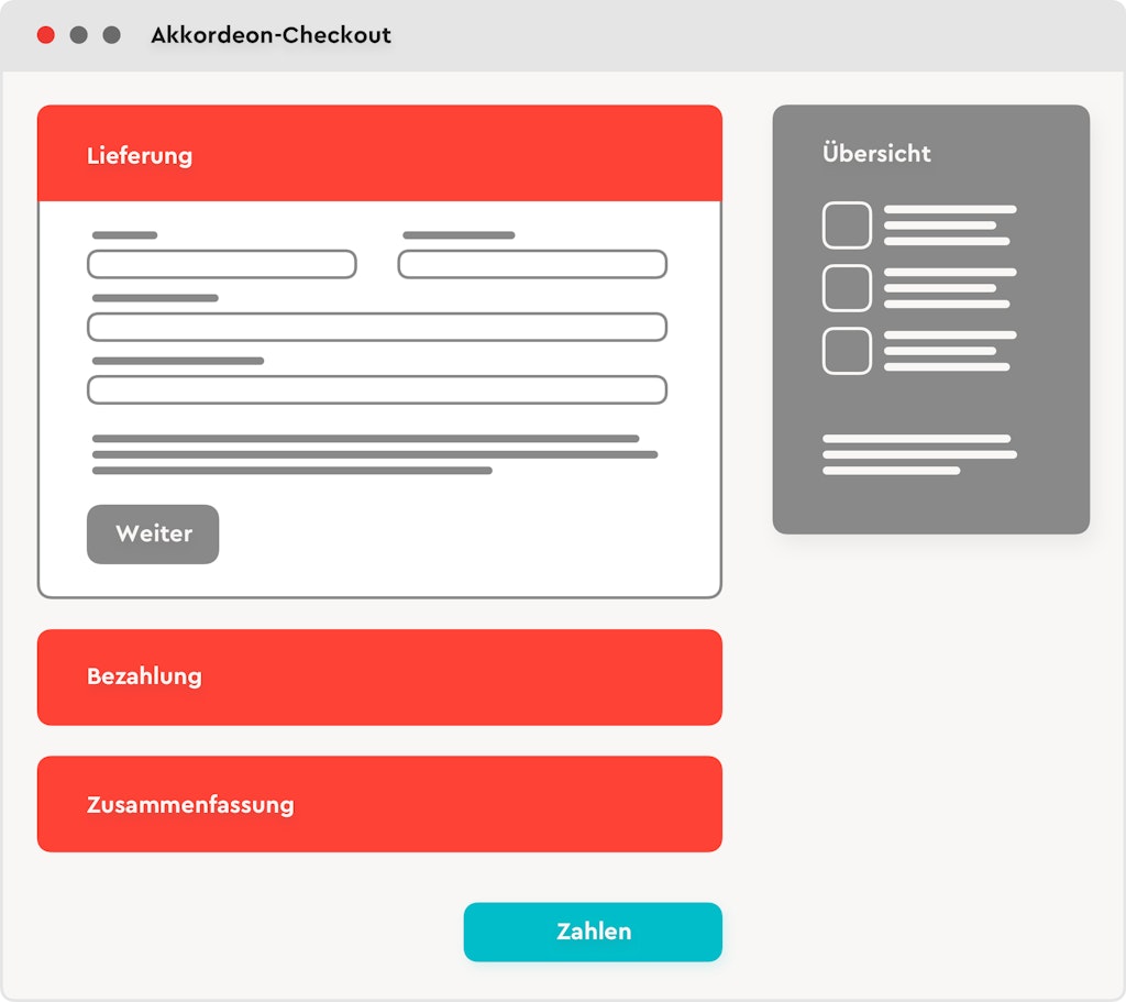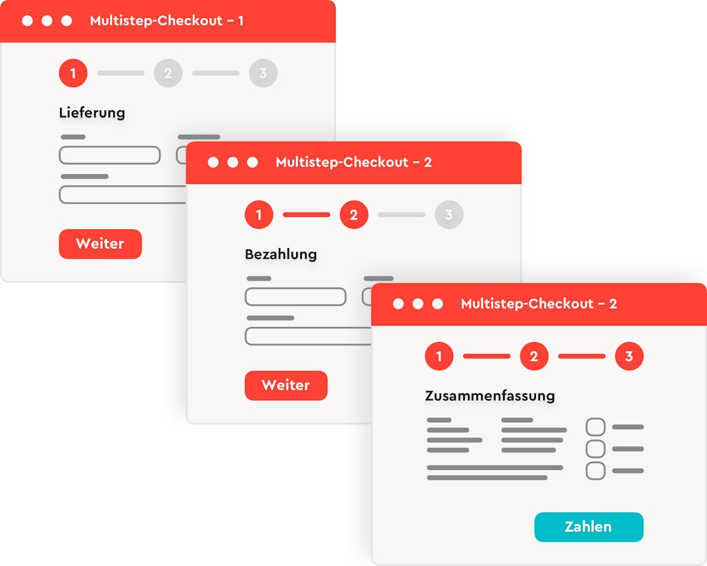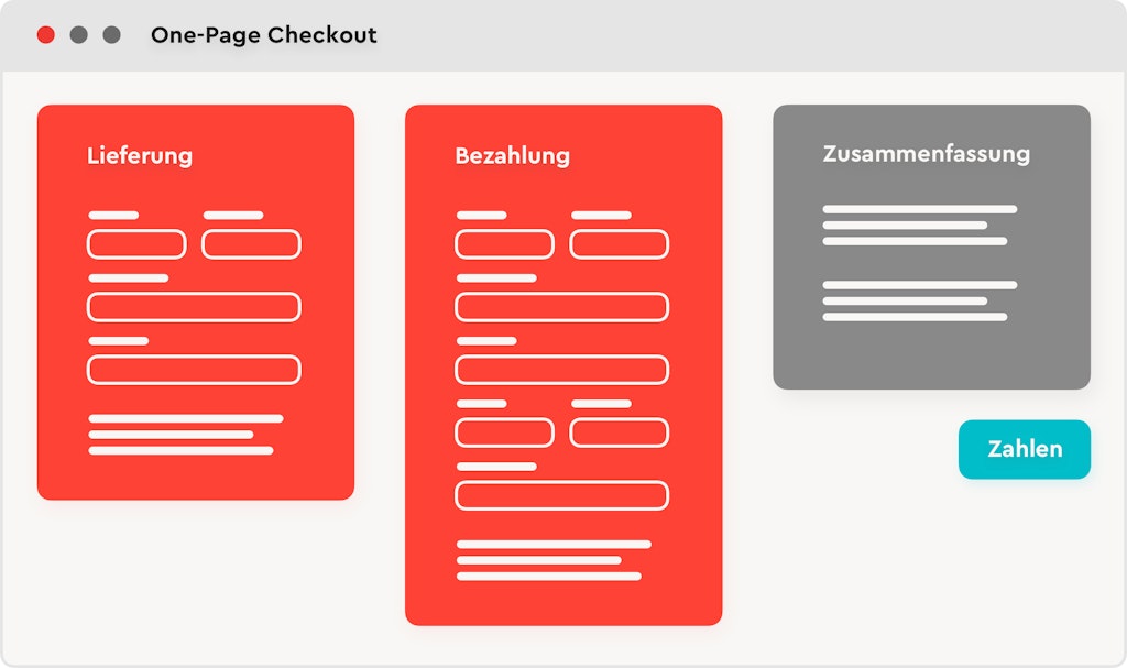 Händler:innen, die schon länger im E-Commerce aktiv sind oder größere Unternehmen mit einer besonders breiten Produktpalette und verschiedenen Vertriebskanälen hätten deutlich mehr Anforderungen an den Checkout ihres Onlineshops. “Wenn ich viele Abhängigkeiten habe, dann wird der Kassenprozess schnell komplex”, beschreibt Florian die Situation. “In solchen Fällen lohnt es sich, von dem Mehrseiten-Prinzip abzuweichen und auf einen Einseiter umzustellen”, empfiehlt der Usability-Experte. In den sogenannten Single-Page-Checkout-Typen ließe sich kleinteiliger arbeiten, ohne dass jedes Mal eine neue Seite geladen werden müsse. Der Haken: Je mehr Eingabemöglichkeiten Kund:innen auf einer Seite hätten, desto höher sei die kognitive Belastung. “Man erzeugt dabei ein hohes ‘Rauschen’ auf dem Bildschirm und lenkt schlimmstenfalls den Fokus vom Bezahlvorgang weg”, warnt Florian. Deshalb sei es bei diesen Checkout-Typen besonders wichtig, die Seite sauber zu strukturieren. “Eine gute Möglichkeit ist es, nacheinander nur den jeweils aktuellen Bereich der Eingabe sichtbar zu machen”, empfiehlt David. Alle anderen Bereiche sollten idealerweise noch versteckt sein. Die notwendige Transparenz, an welcher Stelle man sich im Kassenprozess befinde, ließe sich gut mit einer Statusleiste über der Eingabemaske realisieren.