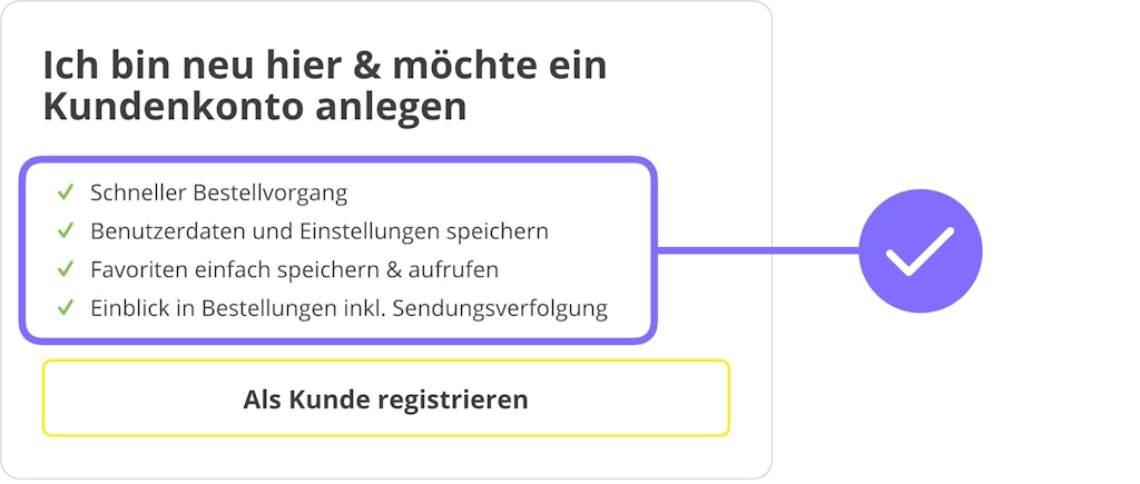 Die richtigen Argumente können Gastkäufer:innen dazu motivieren, ein Kundenkonto anzulegen. Shop-Betreiber:innen sollten ihren Checkout daher um eine Vorteilskommunikation ergänzen. Was haben Kund:innen konkret davon, sich im Shop zu registrieren? Möglicherweise winkt eine Rabattierung beim Einkauf. Oder sie profitieren von einer besonders schnellen Lieferung. Für manche Produkte eignet sich ein Club-Modell, sprich, registrierte Kund:innen werden Teil einer Community Gleichgesinnter. Damit die Vorteile auf fruchtbaren Boden fallen, müssen Barrieren aus dem Weg geräumt sein. So ist es wichtig, an dieser Stelle besonders den vertrauensvollen Umgang mit persönlichen Daten glaubwürdig zu kommunizieren.