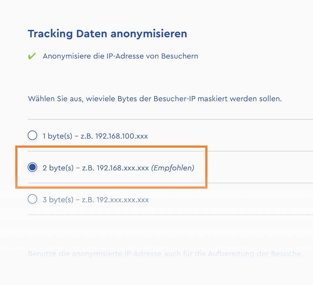 Bei jedem Aufruf einer Webseite über einen Browser wird die IP-Adresse des Nutzers, also dessen Netzwerkadresse, an die aufgerufene Webseite übertragen. Weil IP-Adressen personenbezogene Daten sind, ist der Aufruf einer Webseite immer ein DSGVO-relevanter Vorgang. Aus Datenschutzgründen sollten bei der Anwendung des Tracking Tools die IP-Adressen daher nicht voll protokolliert werden. Matomo bietet dafür das Plugin „PrivacyManager“ an. Dieses wird bei der aktuellen Version bereits mitgeliefert und muss lediglich unter “Einstellungen” aktiviert werden.